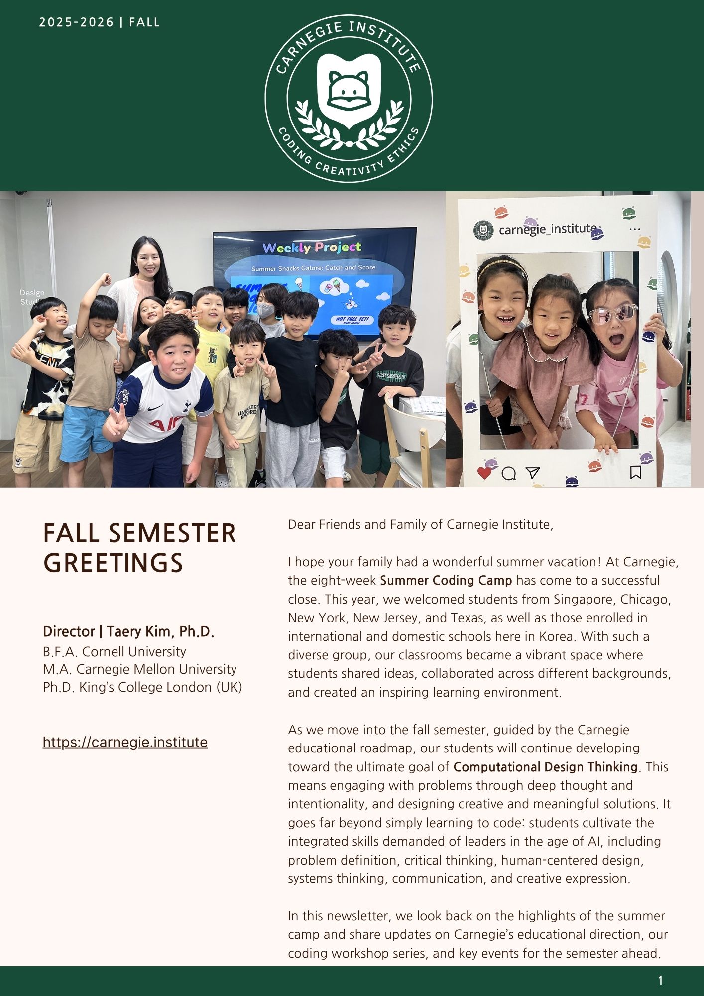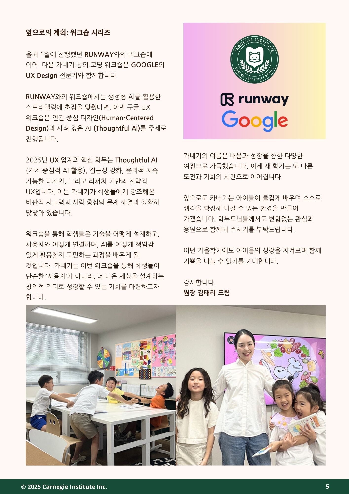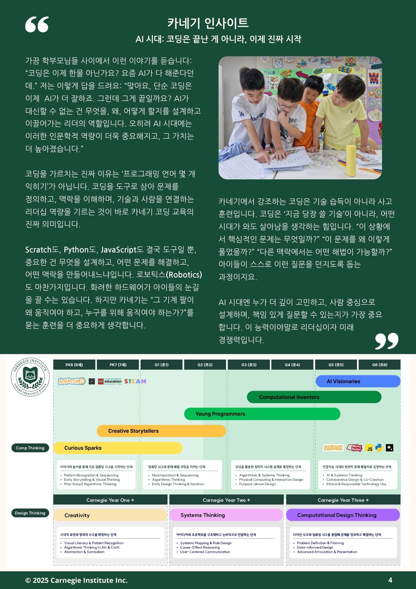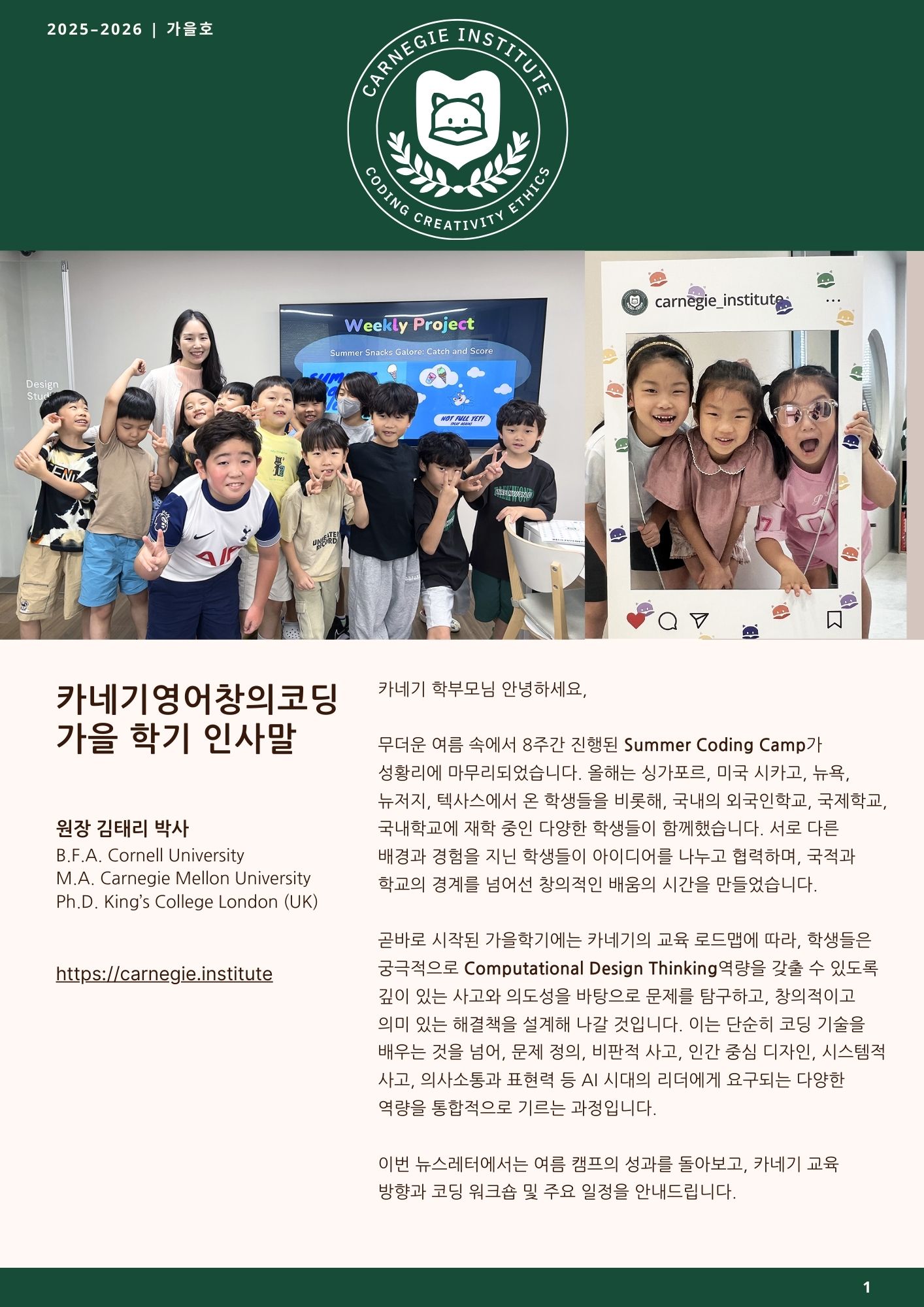 이번 가을 뉴스레터에서는 여름 동안 진행된 카네기 코딩 캠프의 성과와 함께, 새 학기부터 학생들이 나아갈 교육의 방향을 중점적으로 전해드리고자 합니다. 또한 카네기의 코딩 워크숍 시리즈의 다음 주제를 새롭게 안내드립니다. 이번 워크숍은 학생들이 AI 시대에 더욱 의미 있는 창작자로 성장할 수 있도록, 실제 문제 해결과 창의적 표현을 아우르는 새로운 경험을 제공할 예정입니다. 앞으로도 카네기는 학생들이 미래를 선도할 수 있는 역량을 기를 수 있도록 최선을 다하겠습니다. 학부모님의 변함없는 관심과 성원에 감사드립니다.