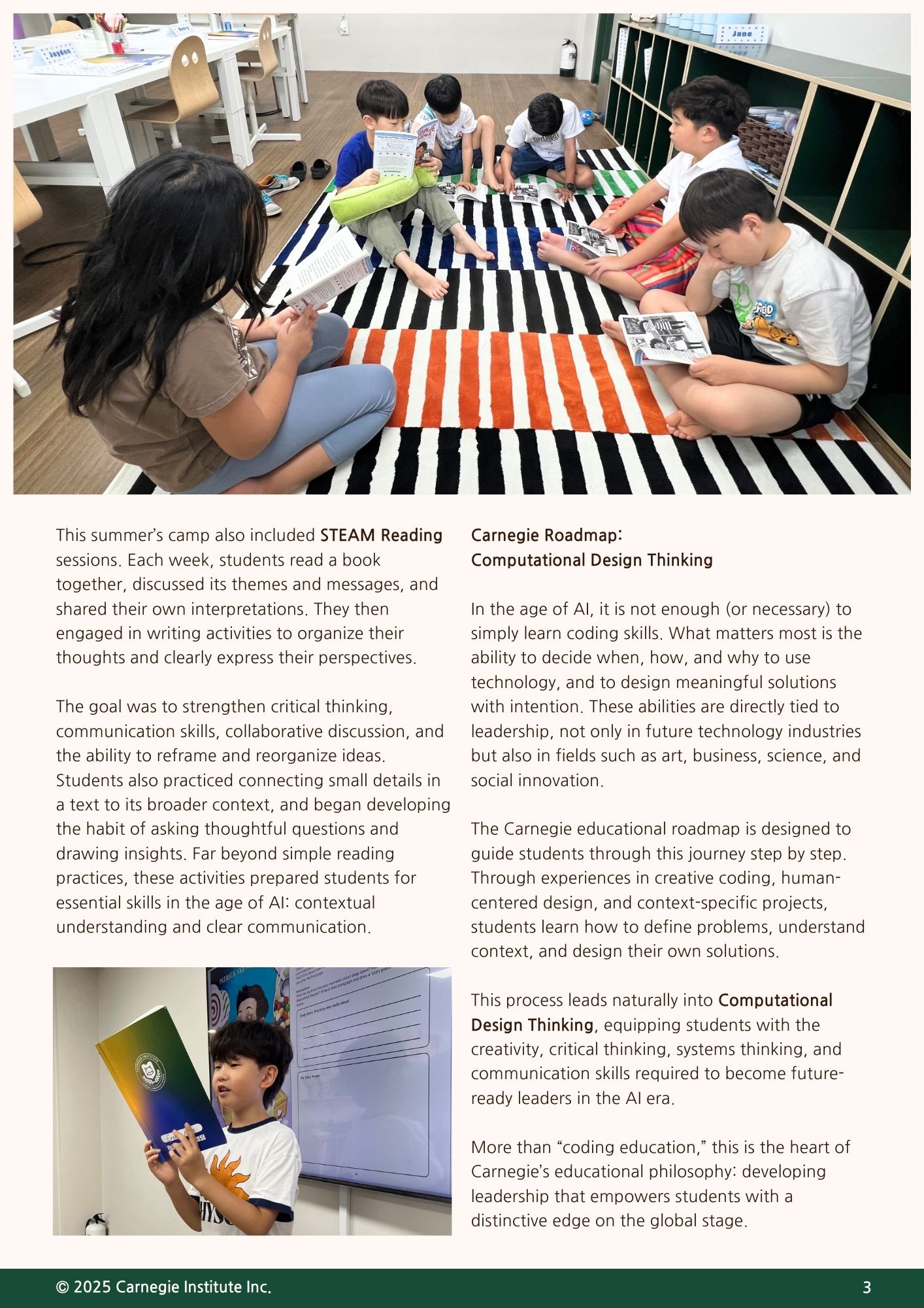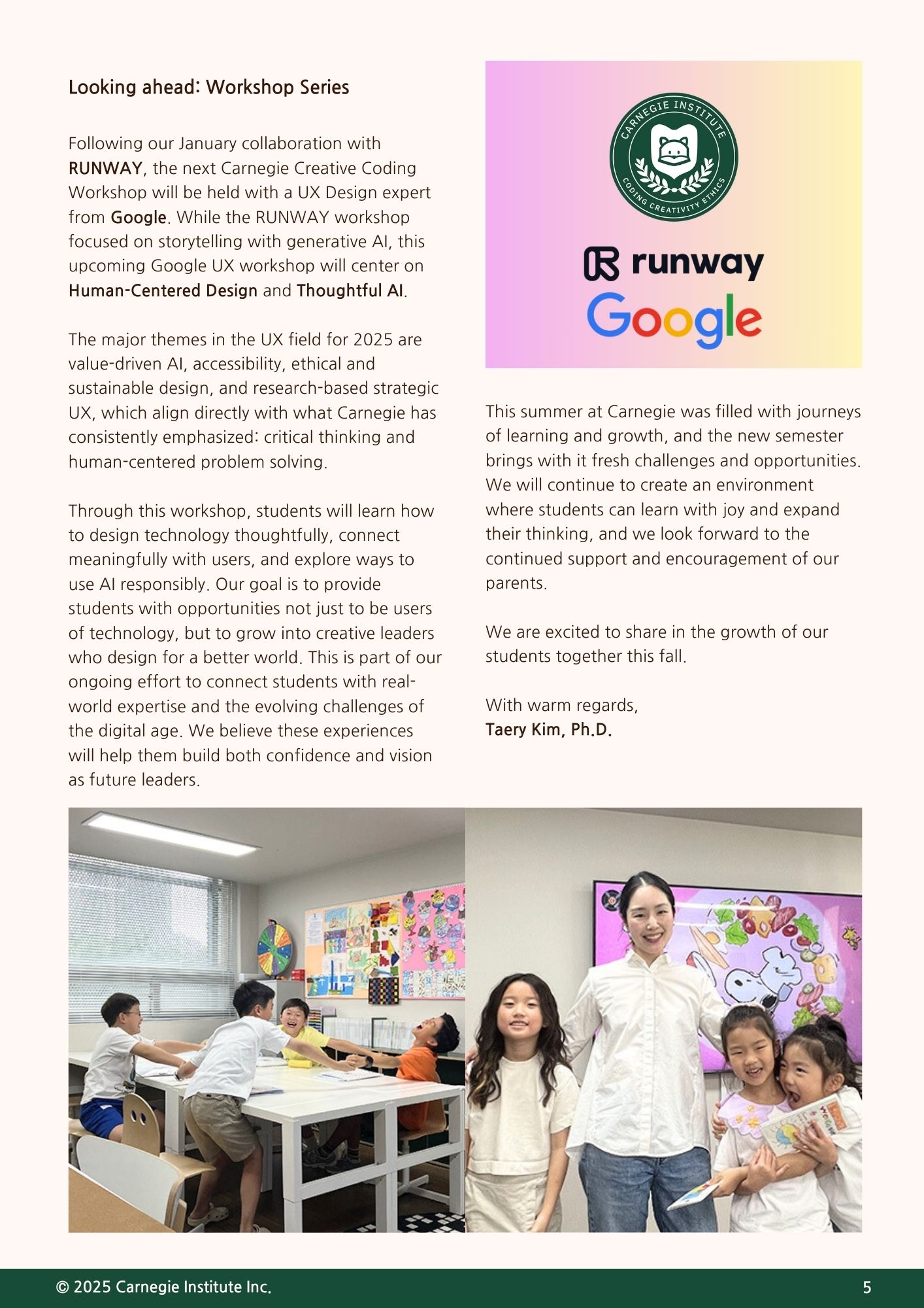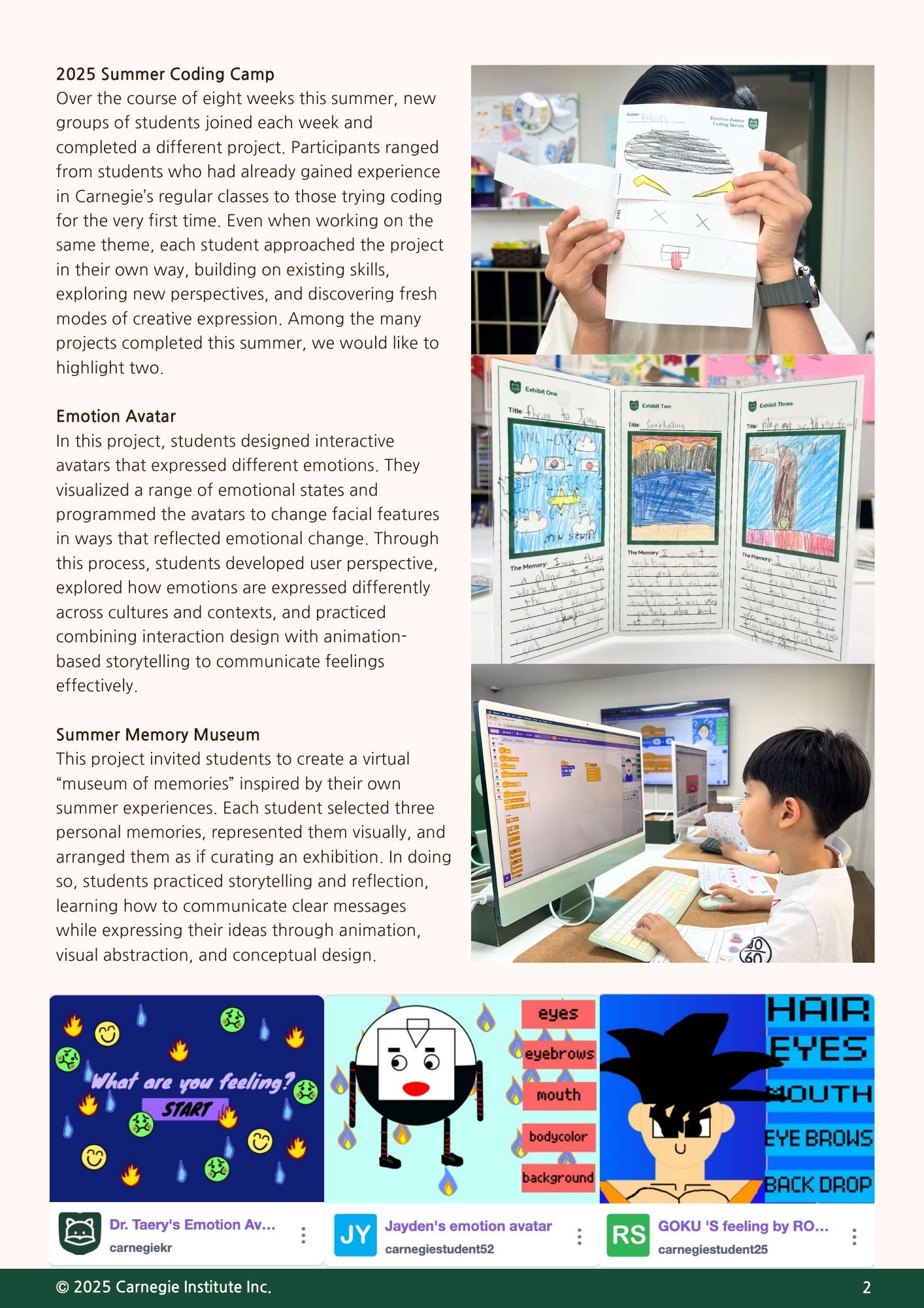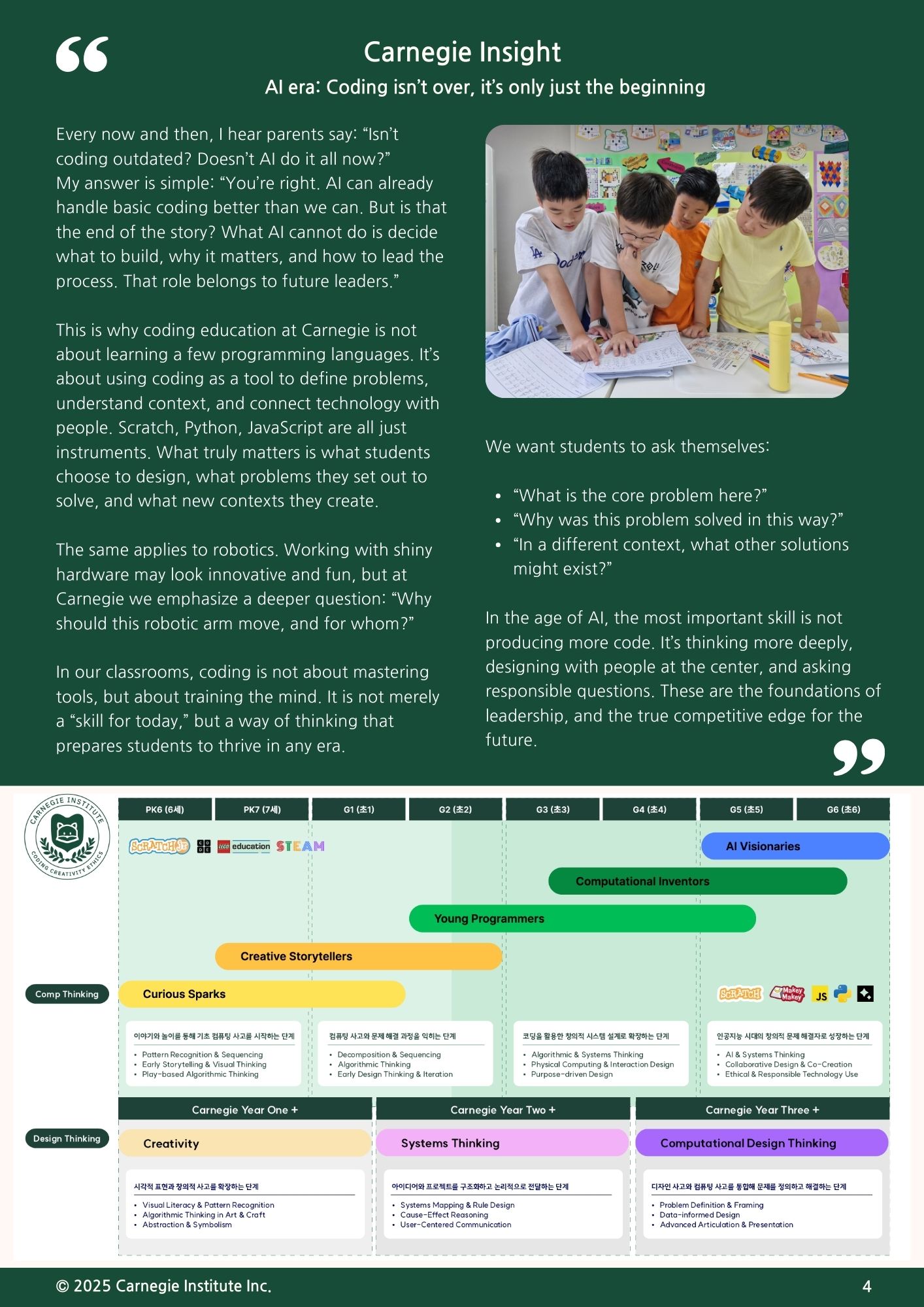 이번 가을 뉴스레터에서는 여름 동안 진행된 카네기 코딩 캠프의 성과와 함께, 새 학기부터 학생들이 나아갈 교육의 방향을 중점적으로 전해드리고자 합니다. 또한 카네기의 코딩 워크숍 시리즈의 다음 주제를 새롭게 안내드립니다. 이번 워크숍은 학생들이 AI 시대에 더욱 의미 있는 창작자로 성장할 수 있도록, 실제 문제 해결과 창의적 표현을 아우르는 새로운 경험을 제공할 예정입니다. 앞으로도 카네기는 학생들이 미래를 선도할 수 있는 역량을 기를 수 있도록 최선을 다하겠습니다. 학부모님의 변함없는 관심과 성원에 감사드립니다.